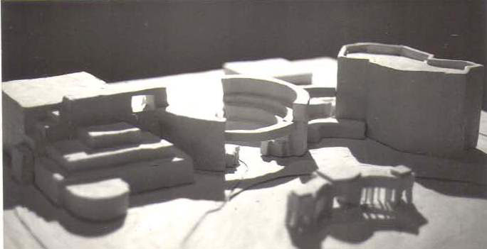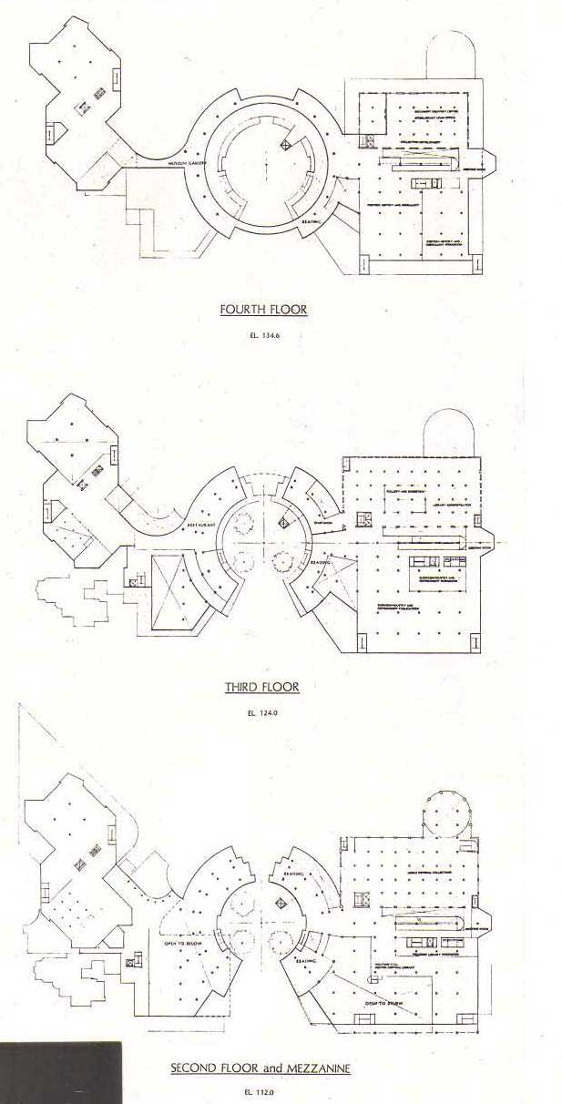 The adjacent cubic space is allocated for stacks within a uniform 30 foot grid. An atrium space between the existing Library and the stacks to the south form a circulation spine of ramps making the succession of stacks at different levels clearly visible.
