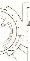 The rings are broken at the street level allowing a portal through the Acoma street axis. The library side of the Kiva supports the most heavily used functions of the library such as the magazine reading areas, circulation desk, new books, and additional study areas. The Denver Art Museum's complimentary half of the Kiva houses new exhibition space, a bookstore, and café.