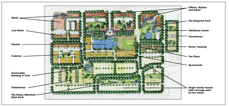 As a neighborhood resident, Niccolo Casewit participated in over 30 meetings over a two-year period. Casewit reviewed proposed drafts of zoning requirements and design guidelines and helped shape the final P.U.D. submitted by the developers, Chuck Perry and Jonathan Rose (and their consultants, Civitas as planners). Niccolo Casewit advised the developers, and members of the Design Committee. Our input resulted in the creation of an unusual sustainable development model for the 27-acre site. The P.U.D. was approved by Denver's City Council in 1998. Single family homes, senior apartments, co-housing, and mixed commercial uses were innovatively combined. Hailed as “new urbanism,” Peter Calthorpe's master plan have subsequently become a national model for “infill” development, influencing the local redevelopment of Lowry Air Force Base and at the Stapleton Development.
