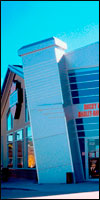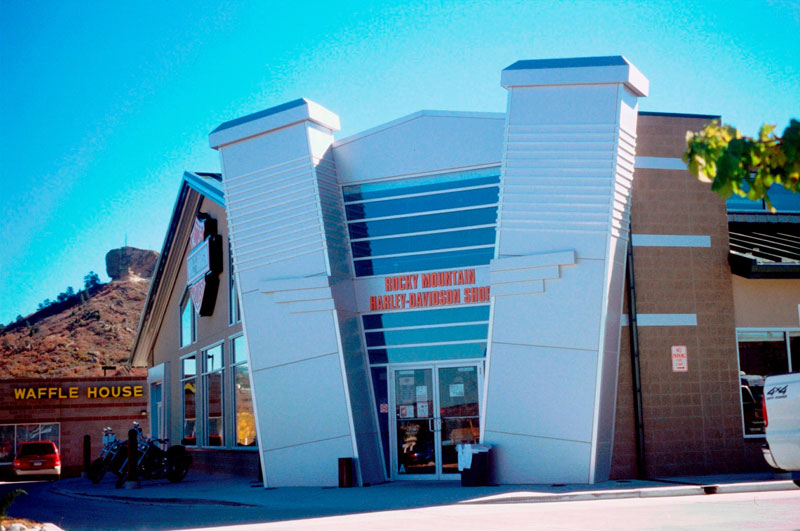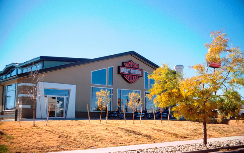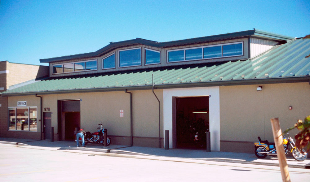 This unusual utilitarian store and shop design features a hybrid pre-manufactured steel building married to the split block masonry entry element. Block Stucco, and aluminum “reyno-bond” building skins were installed on-site. A dramatic corner entry features a giant architectural element inspired by the trademark Harley Davidson “Twin-Vee” engine block. Generous curtain walls and overhead doors help define building identity/ and functions. The two floors are naturally day-lit from above by full length transom windows at the roof.